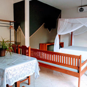 Um banheiro simples e bem espaçoso, na chegada disponibilizamos de uma toalha de banho/rosto por pessoa, camas com lençóis, não fazemos troca.